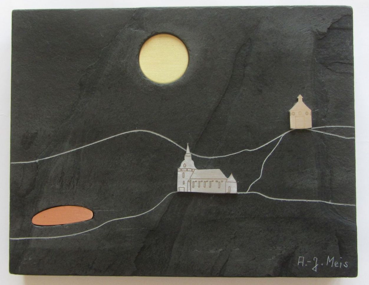 Der Betrachter blickt aus östlicher Richtung, von einer Anhöhe auf das Eifeldorf Steffeln, Links erkennt man das Eichholzmaar, das in den Jahren 2007/2008 renaturiert wurde. In der Bildmitte sieht man die ehemalige Wallfahrtskirche „Sankt Michael“ mit ihrer einmaligen, einzigartigen Turm- bzw. Dachform. Die Kirche steht auf einem mächtigen Tuff- Felsen. Rechts im Bild sieht man die Votivkapelle Walhausen auf dem gleichnamigen Berg auf 560m NN. Von dort hat man einen einmaligen Panoramablick. Im Hintergrund wird der Horizont in der eifeltypischen Hügelform angedeutet..  Wandobjekt aus Naturschiefer, Edelstahl, Messing (poliert) und Kupfer (mit Schmirgelstrich) Kirche und Kapelle erhaben, Sonne und Maar sind eingelassen und aufwendig verarbeitet. Format: 200 x 155 x 2,5 cm